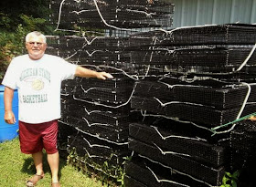 The hope is that permits for shellfish aquaculture will start to be given by mid to late fall. Here Steve Friend of Georgetown stands next to a few dozen cages he's made in anticipation of receiving a permit.
